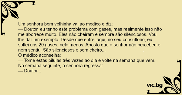 — Doutor -diz ela-, não sei que porcaria o senhor me deu, mas agora meus gases, embora silenciosos, fedem terrivelmente.