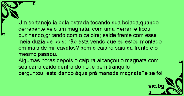 Um sertanejo ia pela estrada tocando sua boiada,quando derrepente veio um magnata, com uma Ferrari e ficou buzinando,gritando com o caipira; saida frente com essa meia duzia de bois; não esta vendo que eu estou montado em mais de mil cavalos? bem o caipira saiu da frente e o mesmo passou.