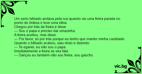 Um serto bêbado andava pela rua quando viu uma freira parada no ponto de ônibus e teve uma idéia.