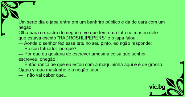 Olha para o mastro do negão e ve que tem uma tatu no mastro dele que estava escrito "RADROSHLIPEPERS" e o japa falou :