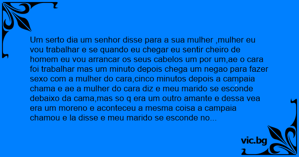 Um serto dia um senhor disse para a sua mulher ,mulher eu vou trabalhar e se quando eu chegar eu sentir cheiro de homem eu vou arrancar os seus cabelos um por um,ae o cara foi trabalhar mas um minuto depois chega um negao para fazer sеxо com a mulher do cara,cinco minutos depois a campaia chama e ae a mulher do cara diz e meu marido se esconde debaixo da cama,mas so q era um outro amante e dessa vea era um moreno e aconteceu a mesma coisa a campaia chamou e la disse e meu marido se esconde no armario mas so q era outro amante e era um branquelo e a mesma coisa e dessa vez era o marido ja dizendo,to sentindo cheiro de homem e começou a tirao oa cabelos dela um por im mas so q ficou um bem pretinho e o marido dela ficou dizendo sai negão sai desgraçado ae o negão sai dizendo eu saio mas tem um no armario e outro na cortina.