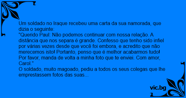 "Querido Paul: Não podemos continuar com nossa relação. A distância que nos separa é grande. Confesso que tenho sido infiel por várias vezes desde que você foi embora, e acredito que não merecemos isto! Portanto, penso que é melhor acabarmos tudo! Por favor, manda de volta a minha foto que te enviei. Com amor, Carol."