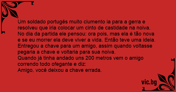 Um soldado portugês muito ciumento ia para a gerra e resolveu que iria colocar um cinto de castidade na noiva. No dia da partida ele pensou: ora pois, mas ela é tão nova e se eu morrer ela deve viver a vida. Então teve uma ideia. Entregou a chave para um amigo, assim quando voltasse pegaria a chave e voltaria para sua noiva.