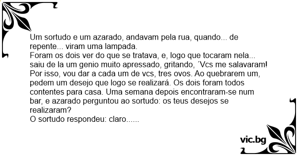 Foram os dois ver do que se tratava, e, logo que tocaram nela... saiu de la um genio muito apressado, gritando, ´Vcs me salavaram! Por isso, vou dar a cada um de vcs, tres ovos. Ao quebrarem um, pedem um desejo que logo se realizará. Os dois foram todos contentes para casa. Uma semana depois encontraram-se num bar, e azarado perguntou ao sortudo: os teus desejos se realizaram?