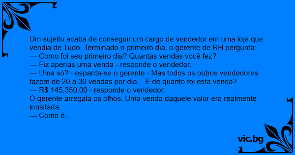 Um sujeito acaba de conseguir um cargo de vendedor em uma loja que vendia de Tudo. Terminado o primeiro dia, o gerente de RH pergunta: