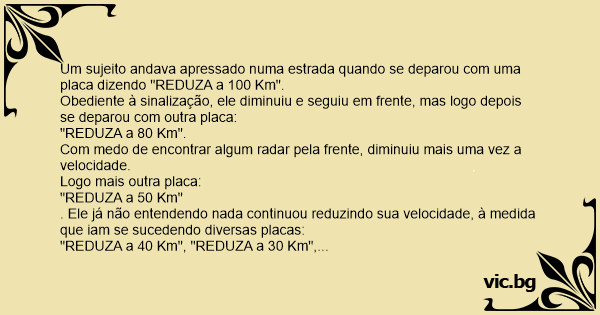 Um sujeito andava apressado numa estrada quando se deparou com uma placa dizendo "REDUZA a 100 Km".