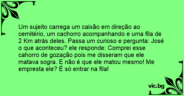 Um sujeito carrega um caixão em direção ao cemitério, um сасhоrrо acompanhando e uma fila de 2 Km atrás deles. Passa um curioso e pergunta: José o que aconteceu? ele responde: Comprei esse cahorro de gozação pois me disseram que ele matava sogra. E não é que ele matou mesmo! Me empresta ele? É só entrar na fila!