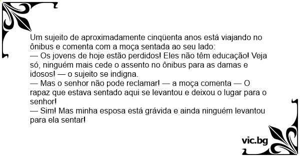 — Os jovens de hoje estão perdidos! Eles não têm educação! Veja só, ninguém mais cede o assento no ônibus para as damas e idosos! — o sujeito se indigna.