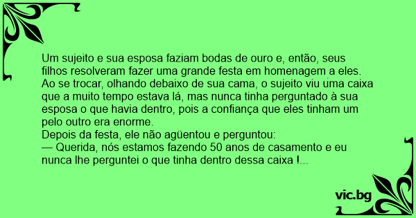 Ao se trocar, olhando debaixo de sua cama, o sujeito viu uma caixa que a muito tempo estava lá, mas nunca tinha perguntado à sua esposa o que havia dentro, pois a confiança que eles tinham um pelo outro era enorme.
