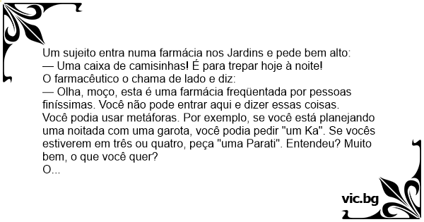 — Olha, moço, esta é uma farmácia freqüentada por pessoas finíssimas. Você não pode entrar aqui e dizer essas coisas.
