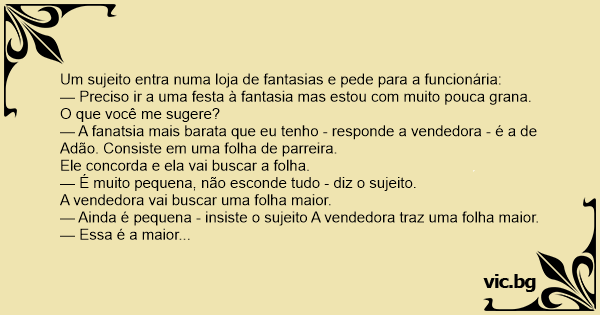 — A fanatsia mais barata que eu tenho - responde a vendedora - é a de Adão. Consiste em uma folha de parreira.