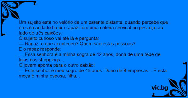 — Este senhor é meu sogro de 46 anos. Dono de 8 empresas... E esta moça é minha esposa, filha única..