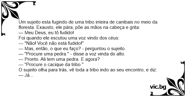 Um sujeito esta fugindo de uma tribo inteira de canibais no meio da floresta. Exausto, ele pára, põe as mãos na cabeça e grita: