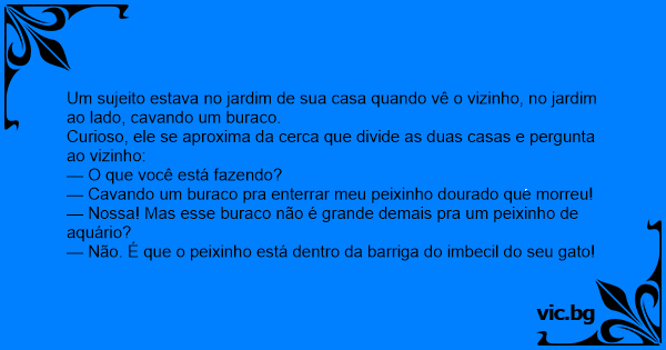 Mariazinha está cavando um buraco no quintal, quando seu vizinho olha por cima da cerca.,- O que você está fazendo menina?,- Meu peixinho morreu, então eu estou cavando um buraco para enterrá-lo.,O vizinho sorri:,- Mas esse buraco não está muito grande para um peixinho...