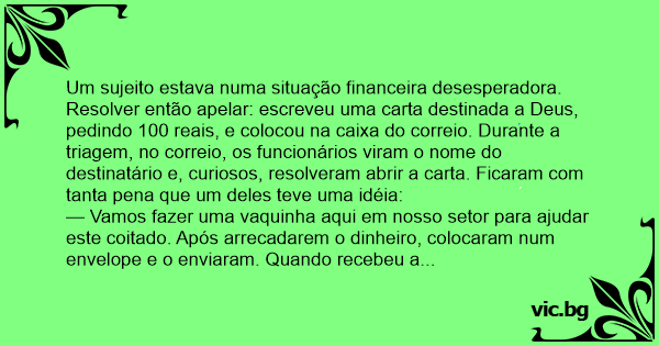 Um sujeito estava numa situação financeira desesperadora. Resolver então apelar: escreveu uma carta destinada a Deus, pedindo 100 reais, e colocou na caixa do correio. Durante a triagem, no correio, os funcionários viram o nome do destinatário e, curiosos, resolveram abrir a carta. Ficaram com tanta pena que um deles teve uma idéia: