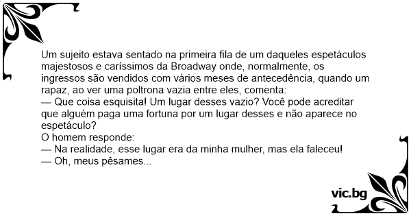 Светско првенство Super Bowl На стадион Уембли се провежда футболния мач на века - националният отбор на Англия срещу отбора на света. Парень купил билет на Кубок Мира по футболу у сотрудника. Ein Mann sitzt im eigentlich ausverkauften Stadion des Fußball-WM-Finales in Deutschland und hat neben sich einen leeren Sitz. Irritiert fragt er den Zuschauer auf der anderen Seite des leeren Platzes, ob der Platz jemanden gehöre. "Nein", lautet die Antwort. "Der Sitz ist leer? Aber das ist... Un avocat fou de football américain avait tout essayé pour obtenir des tickets pour la finale du Superbowl. Il parvint finalement, en payant une somme astronomique, à obtenir deux places côte à... Een man had tickets voor twee goede plaatsen voor de finale van de Champions League. Terwijl hij daar zit komt een andere man naar beneden en vraagt of het zitje naast hem bezet is. "Neen," zegt de... There was a Packers fan with a really crappy seat at Lambeau. Looking with his binoculars, he spotted an empty seat on the 50-yard line. Thinking to himself "what a waste" he made his way down to... änglarna spelade match på Ullevi och det var fullsatt. En man upptäckte att det dock fanns en tom plats intill honom och vände sig till grannen: - Det ser ut att vara någon som fått förhinder. -... Finał mistrzostw świata. Pełen stadion, na całym stadionie, tylko jedno puste miejsce a obok niego siedzi jakiś samotny facet. Po meczu jeden z kibiców pyta tego faceta: - Czy to wolne miejsce... Mecz finałowy mistrzostw świata w piłce nożnej. Siedzi facet. Obok niego puste miejsce. Podchodzi do niego inny facet i pyta, czy ktokolwiek siedzi obok niego: - To miejsce jest wolne. -... It's Game 7 of the Stanley Cup Final, and a man makes his way to his seat right at center ice. He sits down, noticing that the seat next to him is empty. He leans over and asks his neighbor if... It's the 7th game of the Stanley Cup Finals. At the beginning of the game, a guy sits down in his seat and notices an empty seat and another gentleman next to him. "Can you believe it?" the man... Dai was watching a Six Nations game in Cardiff. In the packed stadium there was only one empty seat, right next to him. “Whose is that seat?” asked a man in the row behind. “I got the ticket for my... Pokalspiel gegen Dortmund, der Sportpark ist ausverkauft, nur ein Sitzplatz auf der Tribüne bleibt leer. Der Besitzer der Karte erlaubt einem Zuschauer, der nur eine Stehplatzkarte ergattern... Een man had tickets voor de Gouden Medaille Volleybal wedstrijd te zien op de Olympische Spelen, Op de eerste rij. Als hij gaat zitten, komt een vrouw naar beneden en vraagt of iemand zit in de... Karel heeft eindelijk zijn kaarten voor de WK finale voetbal in zijn bezit gekregen. Als de wedstrijd begonnen is, vraagt een man achter hem of de plaats naast hem vrij is. "Ja", zegt Karel, "die... Joãozinho estava em um estádio de futebol lotado quando um cara que estava passando percebeu que só havia um lugar no estádio que não estava vago e que era ao lado dele. Ele não se conteve de... A man went to the All Stars game with two front row seat tickets. He sat down and then another man asked him if the other chair was taken. The man said " no, it was supposed to be for my wife." The... Ved næstsidste runde i Superligaen, skal FCK og BIF mødes i Parken. Alle billetter er blevet revet væk. Dagen kommer hvor braget skal spilles, og ved et tilfælde kommer 2 gutter, der kender... En el partido final de la Copa del mundo un hincha se queda muy extrañado al ver un asiento vacío, así que le pregunta al tipo de al lado: - Oiga, ¿usted sabe qué pasa con ese asiento?. - Sí, es... En ung mand var virkelig henrykt, da han vandt en billet til Verdensmesterskabet i fodbold imellem Frankrig og Danmark. Hans begejstring kølnedes imidlertid noget, da han fandt ud af, at hans Plads... Stadio Olimpico. Derby Roma – Lazio. Poco prima della partita, un tizio vede in piedi davanti a sè un posto proprio al centro della tribuna, ancora libero, mentre il suo è quasi dietro un pilone.... Na finálovém zápase SuperBowlu v americkém fotbale sedí chlápek na jednom z nejlepších míst. Na narvaných tribunách se mačká spousta lidí a vedle něj je jedno místo volné. Dalšímu chlápkovi v řadě... Egy férfi kap egy ingyenjegyet a focibajnokság döntőjére. Sajnos a jegy a stadion legtávolabbi helyére szól, ahonnan semmit sem lát. A félidőben észreveszi, hogy a pályához közel van egy üres szék.... Finalen i fodbold-VM spilles for et udsolgt stadion. Men en tilskuer ser, at sædet ved siden af er tomt. Til manden på den anden side af sædet siger han: - Hvem er så skør at købe billet til... Stadio. Poco prima della partita, un tizio in piedi vede un bel posto libero, con ottima visuale, proprio al centro della tribuna. Si avvicina e chiede all’uomo seduto a fianco: “Per caso e’ libero... Két férfi beszélget a színházban. Az előttük lévő szék üres. Mondja az egyik: - Te, ez a jegy olyan drága volt! Nézd meg, valaki van olyan bunkó, hogy el se jön! Azután megszólal az üres szék... Финале на светско првенство во фудбал. Целиот стадион распродаден уште пред 5 месеци, а Трпе седи до празно место. Приоѓа некој и со чудење го прашува Трпе. - Абе, дечки кој будала не дошол да го... Marakana puna ko oko, igra se večiti derbi, samo jedna stolica prazna na zapadnoj tribini. Pita gledalac gospodina pored prazne stolice: - Da li možda znate čije je to mesto? - Moje pokojne supruge... A lawyer trying to get tickets to a Broadway show, finally settled for a couple of seats a year in advance. When the exciting night arrived 