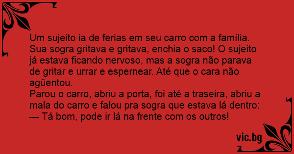 Um sujeito ia de ferias em seu carro com a família. Sua sogra gritava e gritava, enchia o saco! O sujeito já estava ficando nervoso, mas a sogra não parava de gritar e urrar e espernear. Até que o cara não agüentou.