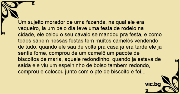Um sujeito morador de uma fazenda, na qual ele era vaqueiro, la um belo dia teve uma festa de rodeio na cidade, ele celou o seu cavalo se mandou pra festa, e como todos sabem nessas festas tem muitos camelôs vendendo de tudo, quando ele sau de volta pra casa já era tarde ele ja sentia fome, comprou de um camelô um pacote de biscoitos de maria, aquele redondinho, quando ja estava de saida ele viu um espelhinho de bolso tambem redondo, comprou e colocou junto com o pte de biscoito e foi simbora, comendo seu bicoito ja era noite e ele comendo os biscoitos, não viu e comeu o espelho tambem, chegando em casa já tarde da noite foi logo dormir e se esqueceu do espelho, ao amanhecer o dia ele acordou com uma vontdade de soltar o barro danada, foi lá no mato se agachou e começou a fazer força, e fazia força e nada da меrdа sair, já estava que não se aguentava mais de dor na barriga, então resolveu chamar o cumpade dele que tambem era vaqueiro para ajuda-lo, falou pro cumpade, oia cumpade eu já tô aqui faiz mais de ora fazeno força pa da uma cagada e num sai nada sô, da uma oiada ai atraiz pa vê o que qui tem ai sô, o cumpade falô pa o ôto, entonce ocê vira a bunda po meu lado que eu vô oiá, quando ele viu, falô, eta cumpade tem um vaquero la dento sô, ai o ôto falô, cumpade du céu, pela amor de deus, fala pa esse infiliz desse vaquero pa ele tira omeno as ispora si não ele me mato sô.