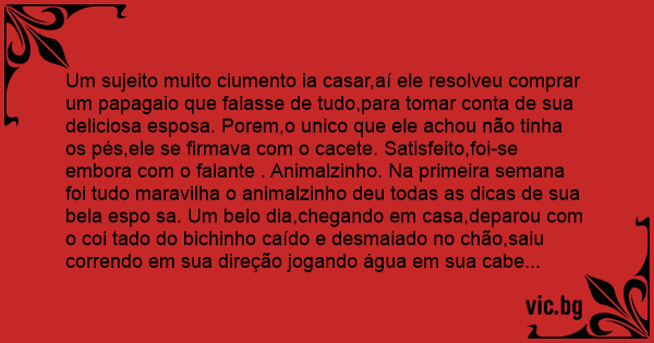 Um sujeito muito ciumento ia casar,aí ele resolveu comprar um papagaio que falasse de tudo,para tomar conta de sua deliciosa esposa. Porem,o unico que ele achou não tinha os pés,ele se firmava com o сасете. Satisfeito,foi-se embora com o falante . Animalzinho. Na primeira semana foi tudo maravilha o animalzinho deu todas as dicas de sua bela espo sa. Um belo dia,chegando em casa,deparou com o coi tado do bichinho caído e desmaiado no chão,saiu correndo em sua direção jogando água em sua cabe ça para que ele voltasse a sí,perguntou o que ha via acontecido com ele. Rapaz,hoje a coisa ficou preta,anda papagaio,anda. Chegou um sujeito escuro com uns 2 metros de altura e eles começaram a se beijar,anda papagaio,anda. Ele tirou sua roupa e a dela também,depois,começaram a se esfregar. Anda papagaio,anda. Eles deitaram aí no sofá,anda papa gaio,anda. Quando o negócio dele subiu,ela abriu a perna,anda papagaio,anda. Anda o саrаlhо,o meu раu subiu eu cai do puleiro e desmaiei.