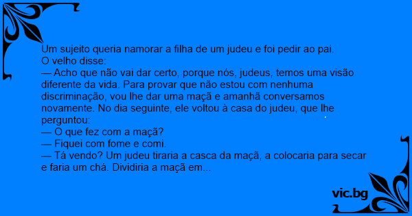— Acho que não vai dar certo, porque nós, judeus, temos uma visão diferente da vida. Para provar que não estou com nenhuma discriminação, vou lhe dar uma maçã e amanhã conversamos novamente. No dia seguinte, ele voltou à casa do judeu, que lhe perguntou: