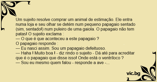 Um sujeito resolve comprar um animal de estimação. Ele entra numa loja e seu olhar se detém num pequeno papagaio sentado (sim, sentado!) num puleiro de uma gaiola. O papagaio não tem patas! O sujeito exclama :