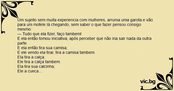 Um sujeito sem muita experiencia com mulheres, arruma uma garota e vão para um motele lá chegando, sem saber o que fazer pensou consigo mesmo: