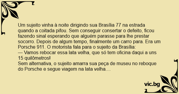 Um sujeito vinha à noite dirigindo sua Brasília 77 na estrada quando a coitada pifou. Sem conseguir consertar o defeito, ficou fazendo sinal esperando que alguém parasse para lhe prestar socorro. Depois de algum tempo, finalmente um carro para. Era um Porsche 911. O motorista fala para o sujeito da Brasília: