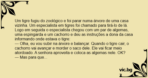 — Olha, eu vou subir na árvore e balançar. Quando o tigre cair, o сасhоrrо vai avançar e morder o saco dele. Ele vai ficar meio atordoado. A senhora aproveita e coloca as algemas nele. OK?