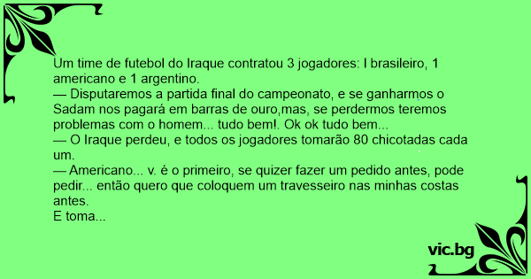 — Disputaremos a partida final do campeonato, e se ganharmos o Sadam nos pagará em barras de ouro,mas, se perdermos teremos problemas com o homem... tudo bem!. Ok ok tudo bem...
