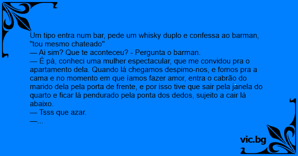 Um tipo entra num bar, pede um whisky duplo e confessa ao barman, "tou mesmo chateado"