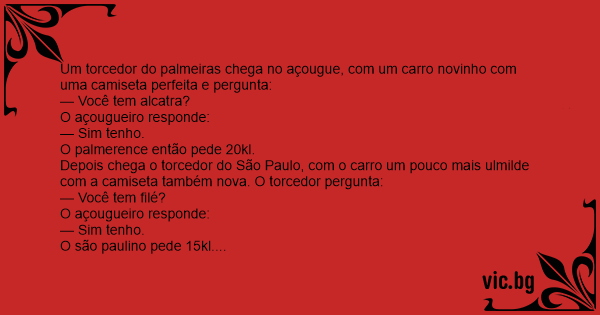 Um torcedor do palmeiras chega no açougue, com um carro novinho com uma camiseta perfeita e pergunta: