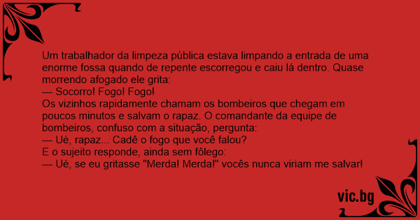 Um trabalhador da limpeza pública estava limpando a entrada de uma enorme fossa quando de repente escorregou e caiu lá dentro. Quase morrendo afogado ele grita: