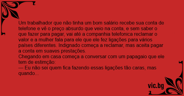 No outro dia ele estava indo para o trabalho, saindo, fecha a porta e fiса espiando pelo buraco para ver quem estava ligando, e vê o papagaio pegando o telefone e telefonando. Entra de surpresa e pega o papagaio e diz: