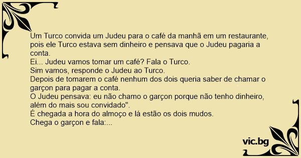 Um Turco convida um Judeu para o café da manhã em um restaurante, pois ele Turco estava sem dinheiro e pensava que o Judeu pagaria a conta.