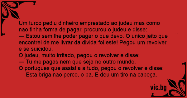 Um turco pediu dinheiro emprestado ao judeu mas como nao tinha forma de pagar, procurou o judeu e disse: