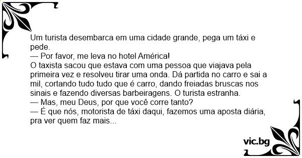 — É que nós, motorista de táxi daqui, fazemos uma aposta diária, pra ver quem faz mais atropelamentos por dia. Eu já estou terminando hoje e até agora só atropelei quatro pessoas. Tem um cara lá que atropelou cinco, e, pelo jeito vai ganhar a aposta.