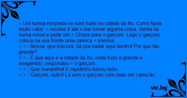 > Um turista hospeda-se num hotel na cidade de Itu. Como fazia muito calor, > resolve ir ate o bar tomar alguma coisa. Senta-se numa mesa e pede um > Chope para o garçom. Logo o garçom coloca na sua frente uma caneca > imensa.