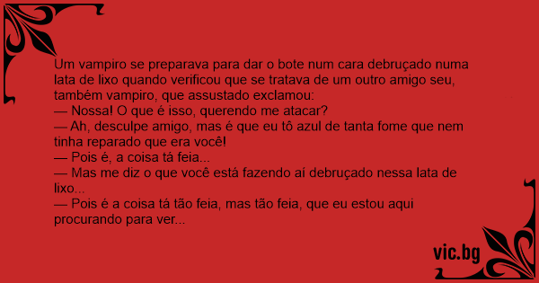 Um vampiro se preparava para dar o bote num cara debruçado numa lata de lixo quando verificou que se tratava de um outro amigo seu, também vampiro, que assustado exclamou: