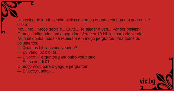 Um velho de idade vendia biblias na praça quando chegou um gago e lhe disse: