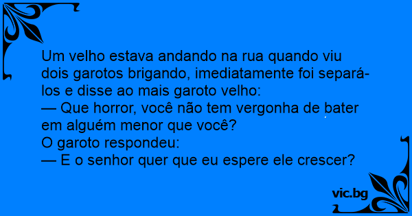 Um velho estava andando na rua quando viu dois garotos brigando, imediatamente foi separá-los e disse ao mais garoto velho: