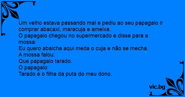 Um velho estava passando mal e pediu ao seu papagaio ir comprar abacaxi, maracuja e ameixa.