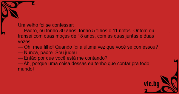 — Padre, eu tenho 80 anos, tenho 5 filhos e 11 netos. Ontem eu transei com duas moças de 18 anos, com as duas juntas e duas vezes!