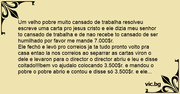 Um velho pobre muito cansado de trabalha resolveu escreve uma carta pro jesus cristo e ele dizia meu senhor to cansado de trabalha e de nao recebe to cansado de ser humilhado por favor me mande 7.000$r.