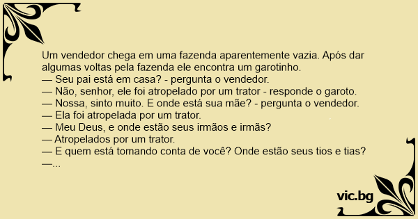 Един човек срещнал Иванчо и го попитал: два заека се разхождат. Двама се срещнали на пътя и единият попитал: Eine Frau fragt Fritzchen: "Wo ist deine Mutter?" Ruft die Frau Maier an und fragt: "Ist deine Mutter da?" Fritzi am Telefon. "Nein vom Traktor überfahren." "Ist der Papa da?" "Nein vom Traktor überfahren!" "Ist sonst jemand zu Hause?" "Nein die sind alle vom Traktor überfahren!" "Und was machst du???" "Traktor fahrn!!!" Er staat een verkoper bij Jantje aan de deur en vraagt “Is je moeder misschien thuis?” “Nee,” zegt Jantje “die is onder de trekker gekomen.” “Oh, sorry wat vreselijk” zegt de verkoper “is... Er word aan de deur gebeld, Jantje doet de deur open. Een man staat voor de deur en vraagt: "is je vader thuis" Jantje zegt: "nee, hij is overreden door een tractor" de man vraagt: "is je moeder... Un turist, batand drumurile, ajunge la o casa de tara. Locurile par cam pustii, dar curand apare un baietas. - Hei pustiule, intreaba turistul, unde e tatal tau? - Tata e mort, l-a calcat... Un esattore delle tasse va in una casa in campania e dice: "C'è qualche tuo parente?" Ed il bimbo risponde: "No, anche quelli alla lontana sono morti sotto un trattore... Esattore: "Povero... En lille dreng sad og legede En lille dreng sad og legede på brostenene på en gårdsplads, da en mand kommer forbi og spørger: - Goddag, lille ven, er din far hjemme? - Næh, svarer drengen, han er... Komt een man bij een boerderij, belt aan en er doet een klein jochie open. De man vraagt of zijn vader thuis is, waarop het jochie Andwoordt: "Nee, is overreden door een tractor." De man vraagt... En handelsmann ringte lille Per: - Har du mor eller far hjemme? - Nei, de ble påkjørt av traktoren. - Har du noen eldre søsken hjemme, da? - Nei, de ble også påkjørt av traktoren. - Hva gjør du... Eina petriukas mokykloj: spjaudosi, keikiasi, musa kitus vaikus. Prieina direktorius ir sako: - Petriuk!!!,rytoj ateini i mokykla su mama resysi pasiaiskinima del netikusio elgesio. Petriukas sako:...