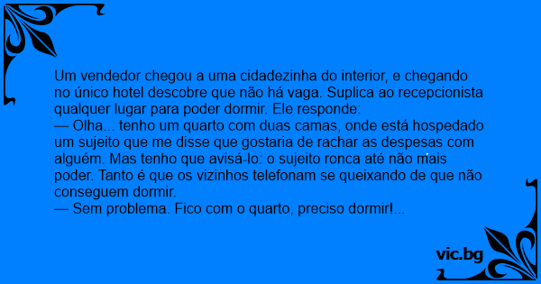 — Olha... tenho um quarto com duas camas, onde está hospedado um sujeito que me disse que gostaria de rachar as despesas com alguém. Mas tenho que avisá-lo: o sujeito ronca até não mais poder. Tanto é que os vizinhos telefonam se queixando de que não conseguem dormir.