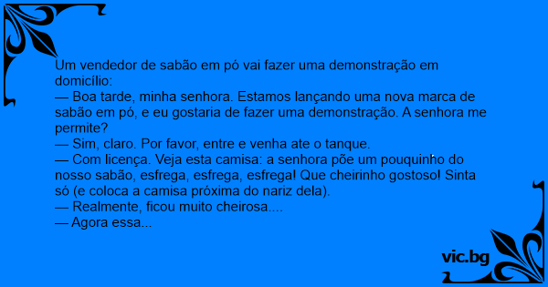 — Com licença. Veja esta camisa: a senhora põe um pouquinho do nosso sabão, esfrega, esfrega, esfrega! Que cheirinho gostoso! Sinta só (e coloca a camisa próxima do nariz dela).