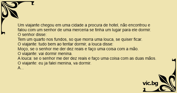O viajante se amimou e deu os dez reais, e a louca pois uma mão em cada orelha, a ligua para fora e fez: hummmmmmmm...