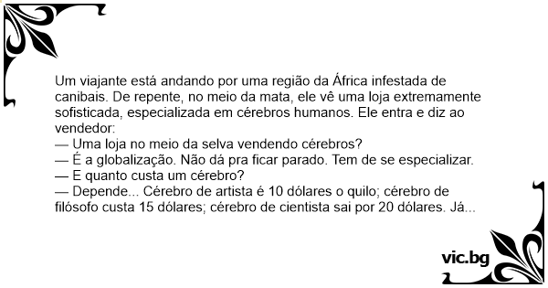 Um viajante está andando por uma região da África infestada de canibais. De repente, no meio da mata, ele vê uma loja extremamente sofisticada, especializada em cérebros humanos. Ele entra e diz ao vendedor: