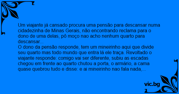 O dono da pensão responde, tem um mineirinho aqui que divide seu quarto mas todo mundo que entra lá ele traça. Revoltado o viajante responde: comigo vai ser diferente, subiu as escadas chegou em frente ao quarto chutou a porta, o armário, a cama quase quebrou tudo e disse: e ai mineirinho nao fala nada, não faz nada?