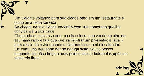 Ele com uma tremenda dor de barriga solta alguns peidos enquanto ela não chega,e mais peidos altos e fedorentos,após ela voltar ela tira a venda do olho dele quando a família dela estava toda na sala de estar.